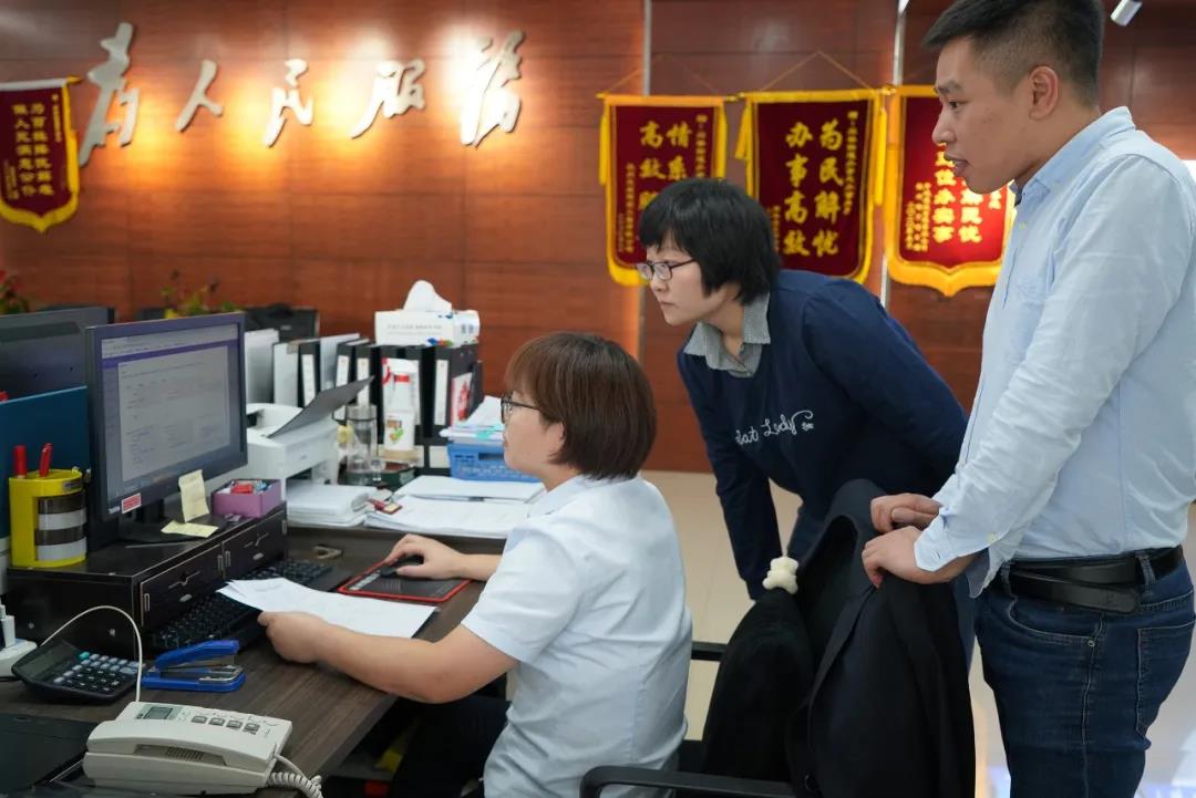 ▲閑林街道紀工委工作人員正在查閱聯榮村所有“靈活就業補助”人員的申報信息