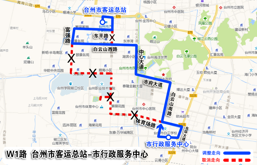 為提升區域公共交通服務水平,結合市民出行需求,自2020年11月24日起,W1路公交線將由原市體育中心環線調整為客運總站公交樞紐至市行政服務中心。調整后由客運總站公交樞紐始發,經椒黃路-學院路-東平路-富強路-白云山西路,再按原線路至開發大道(市行政服務中心)終點站。