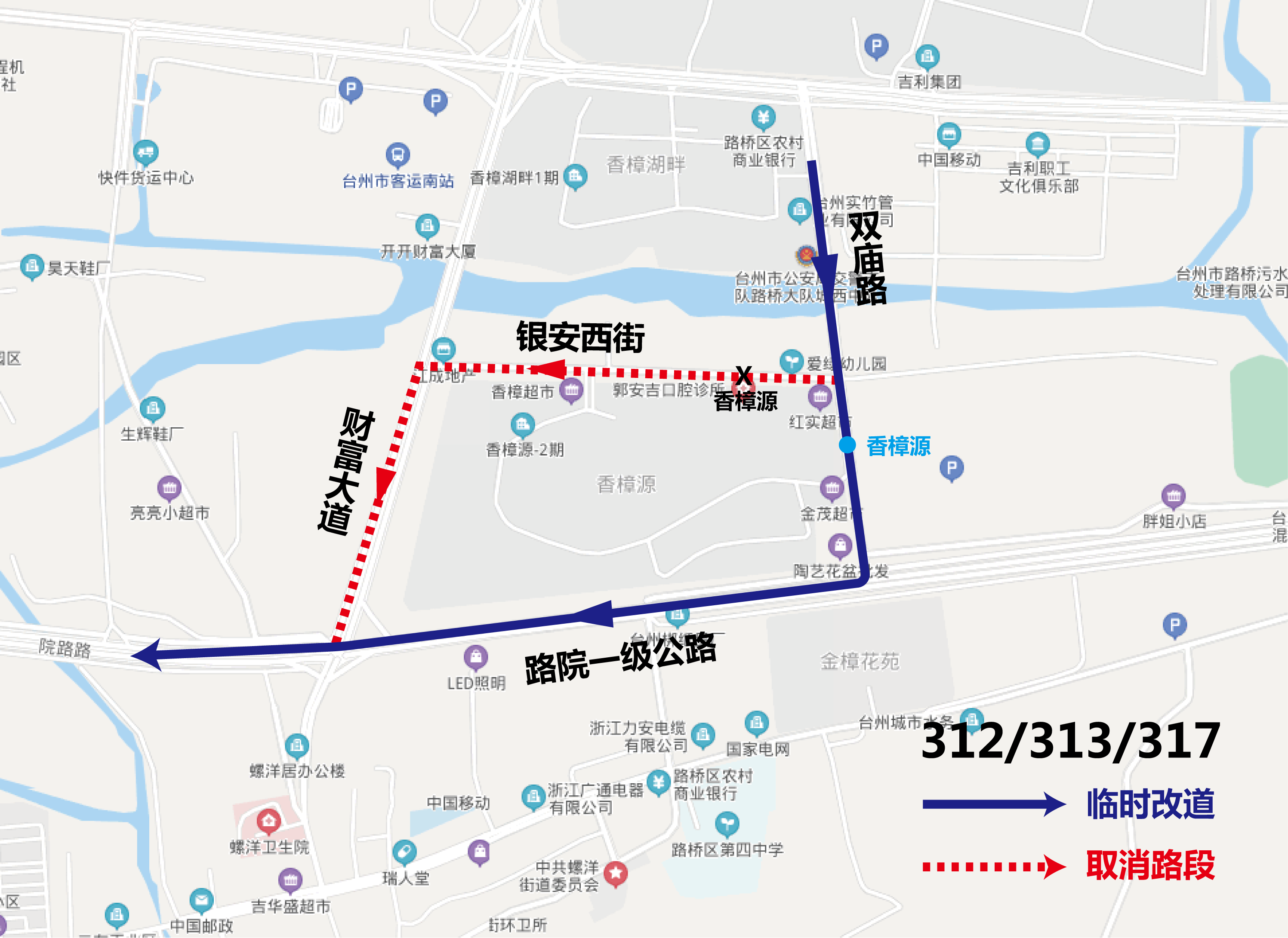 312路(臺州客運東站-鑒洋村方向)、313路(新日用品商城北-新日用品商城北方向)、317路(恩澤醫院-中岙里村方向),調整走向為雙廟路-路院一級公路,再回原線路運營。臨時改道期間香樟源公交站點臨時移至雙廟路(香樟源小區東面)。