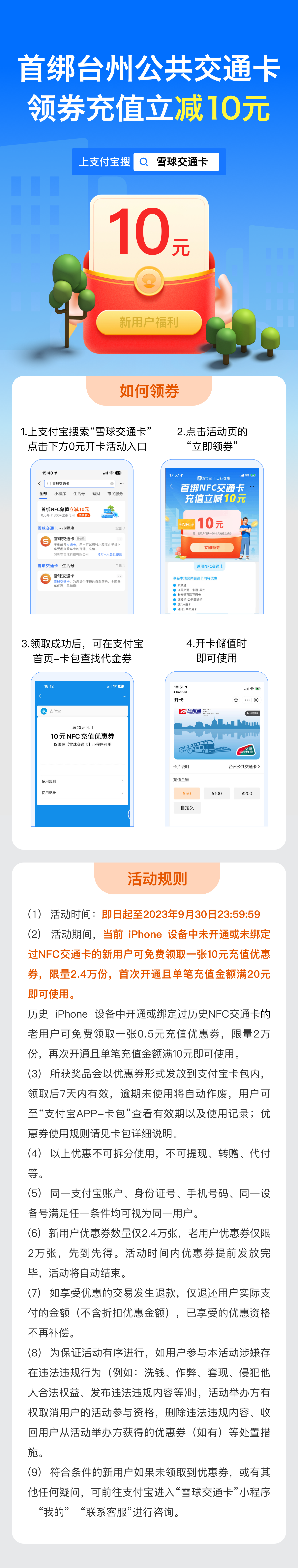 活動進行中 | 支付寶首綁臺州公共交通卡,領券充值立減10元