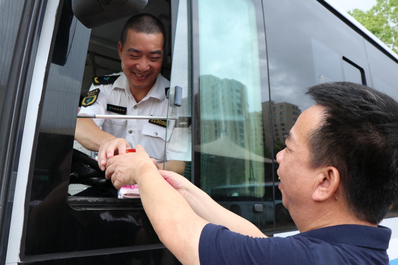 7月26日上午,臺州市交通運輸局副局長童連生、運輸管理處負責人侯靈健、巴士公司總經理韓克華、黨委委員倪建國及相關人員,為公交司機、維修工們開展防暑關懷活動,通過發放加多寶、毛巾等消暑物品,為一線工作者們送去夏日的清涼與關愛。