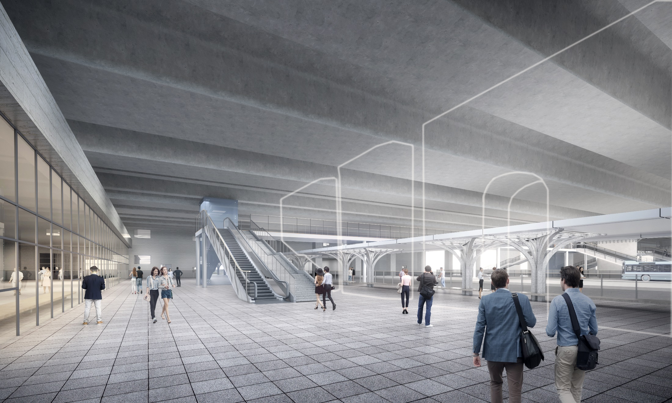 橋下空間項目位于臺州站鐵路橋南、北側,含公交車場和出租車場兩部分。公交車場約29936㎡(其中:公交車場27018㎡、候車廳2277㎡、管理用房641㎡),公交車位58個;出租車場約5082㎡(車場4484㎡、候車廳598㎡),出租車位57個??偨ㄖ娣e3516㎡,房屋建筑層高為4.8~6.8m,均為地上1層,公交、出租候車廳為鋼框架結構,管理用房為鋼砼框架結構。候車廳與候車站臺間設置鋼桁架人行天橋102.5m/1座,橋高4.75m,橋寬3.1m,結合天橋分別設置自動扶梯和垂直電梯。