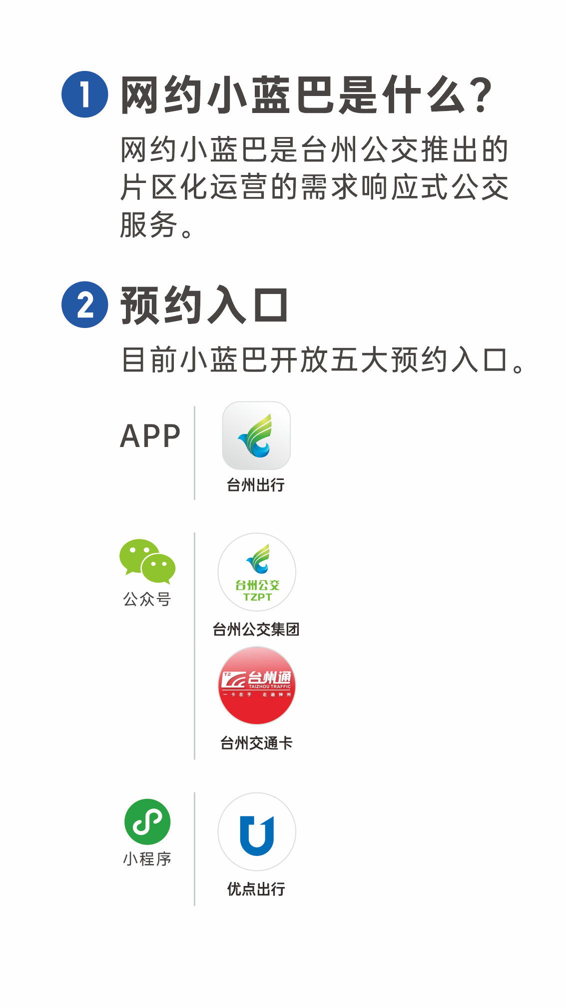 市民可通過臺州出行App首頁“小藍巴”;臺州公交集團、臺州交通卡微信公眾號服務菜單“小藍巴”;優點出行微信小程序“動態公交”等入口進入動態公交平臺在線實時預約乘坐。也可以掃描站牌上的站臺碼或在跟司機確認車輛順路后使用補票碼乘坐“網約小藍巴”。