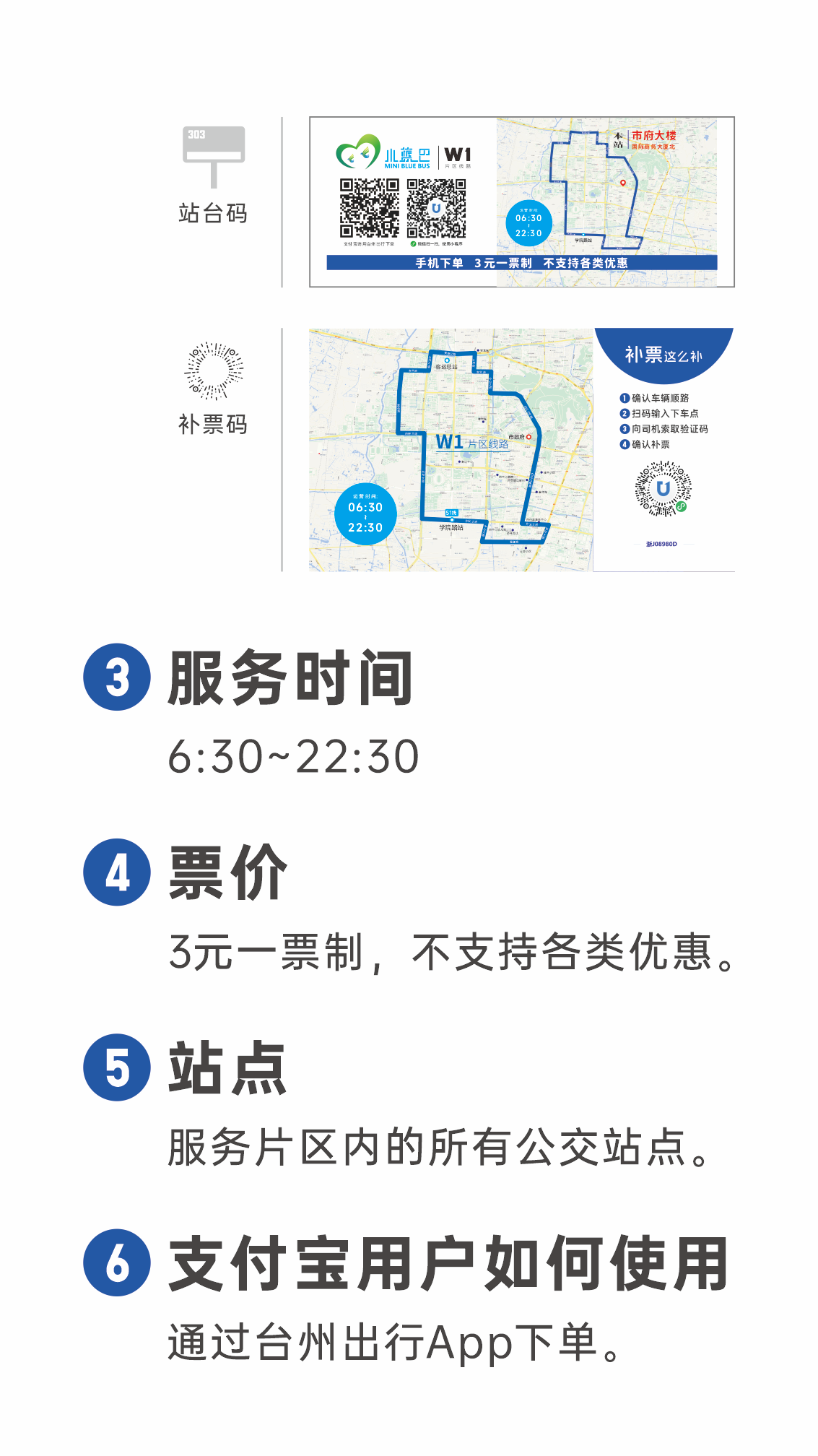 “網約小藍巴”W1路片區線路以黃海公路、沚京街、東平路、中心大道、白云山中路、白云山南路、開發大道、東環大道、春潮路、中心大道、開發大道、臺州大道、市府大道、富強路、東平路、臺州大道合圍區域為運營片區。以片區內所有公交站點作為乘客上下車點。