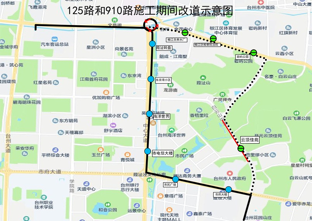 四、125路和910路調整由黃海公路經中心大道、市府大道接原線路。期間取消椒江自來水廠、椒江區檢察院法院、巖嶼公園、云頂佳苑站,經停葭沚轉盤、東京灣小區、海洋世界、市電信大樓、市民廣場、市府大樓站。