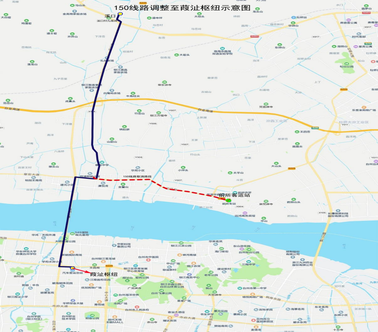 調整后走向:Y007鄉道-Y004鄉道-章梓路-沿江路-臺州大道-黃海公路。