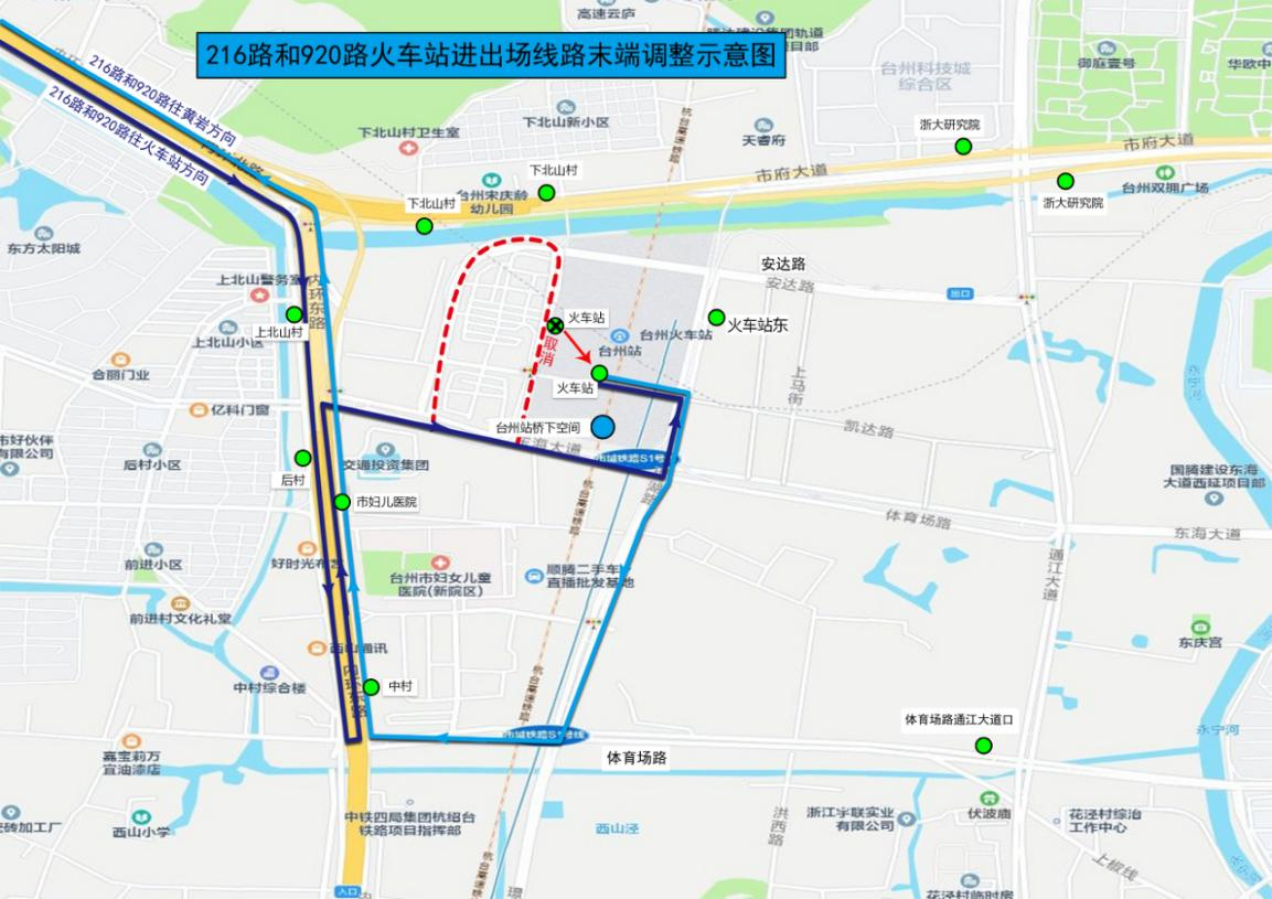 調整由體育場路、璟湖路進入臺州火車站公交樞紐站新場站。