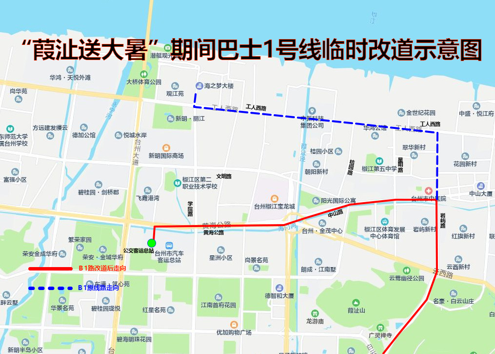 調整由客運總站始發,經黃海公路—葭沚轉盤—中山路—巖嶼路—原線路。取消市中醫院東、椒江實驗二小、江濱新村、工人西路星明路口、桔園北路口、桔園小學北、星光菜場、工人西路學院路口、大橋公園漁家樂等站點。請乘客們就近至黃海公路、中山路沿線乘車。