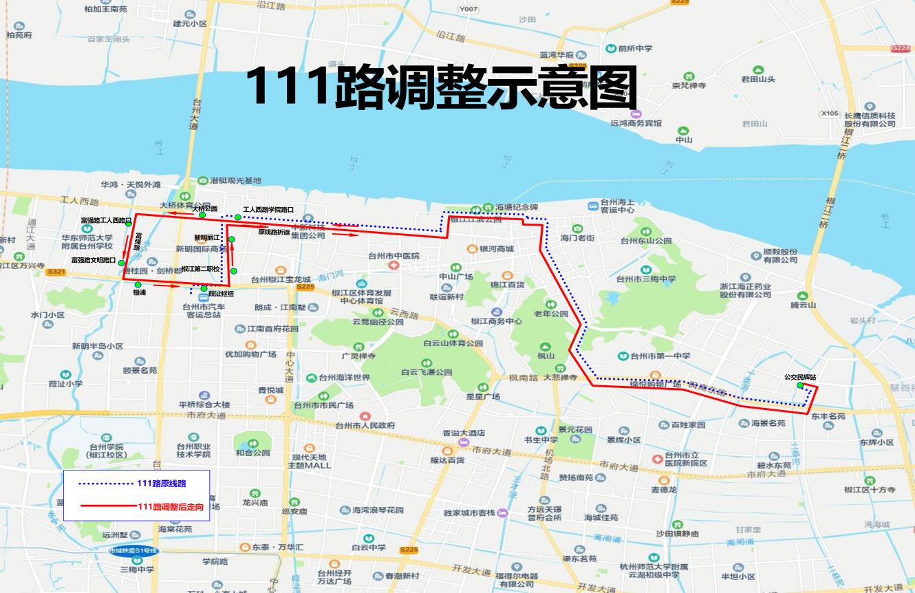 1.觀江苑及周邊小區乘客可在大橋公園站乘坐調整后的111路到葭沚樞紐,往市民廣場、市中心醫院方向可換乘136、510等線路;往椒江老城區及市立醫院新院方向可換乘101、138等線路。
