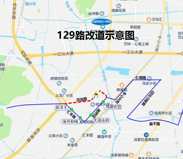 為配合市國博中心項目東側海州街道道路工程施工需要,即日起途經施工區域的129路臨時改道經鑫茂街、匯豐路至龍潭岙。期間臨時增設鴻源社區、天潤合府、海月和鳴、后洋王站點。同步取消市國博中心、上洋廠小區臨時站。