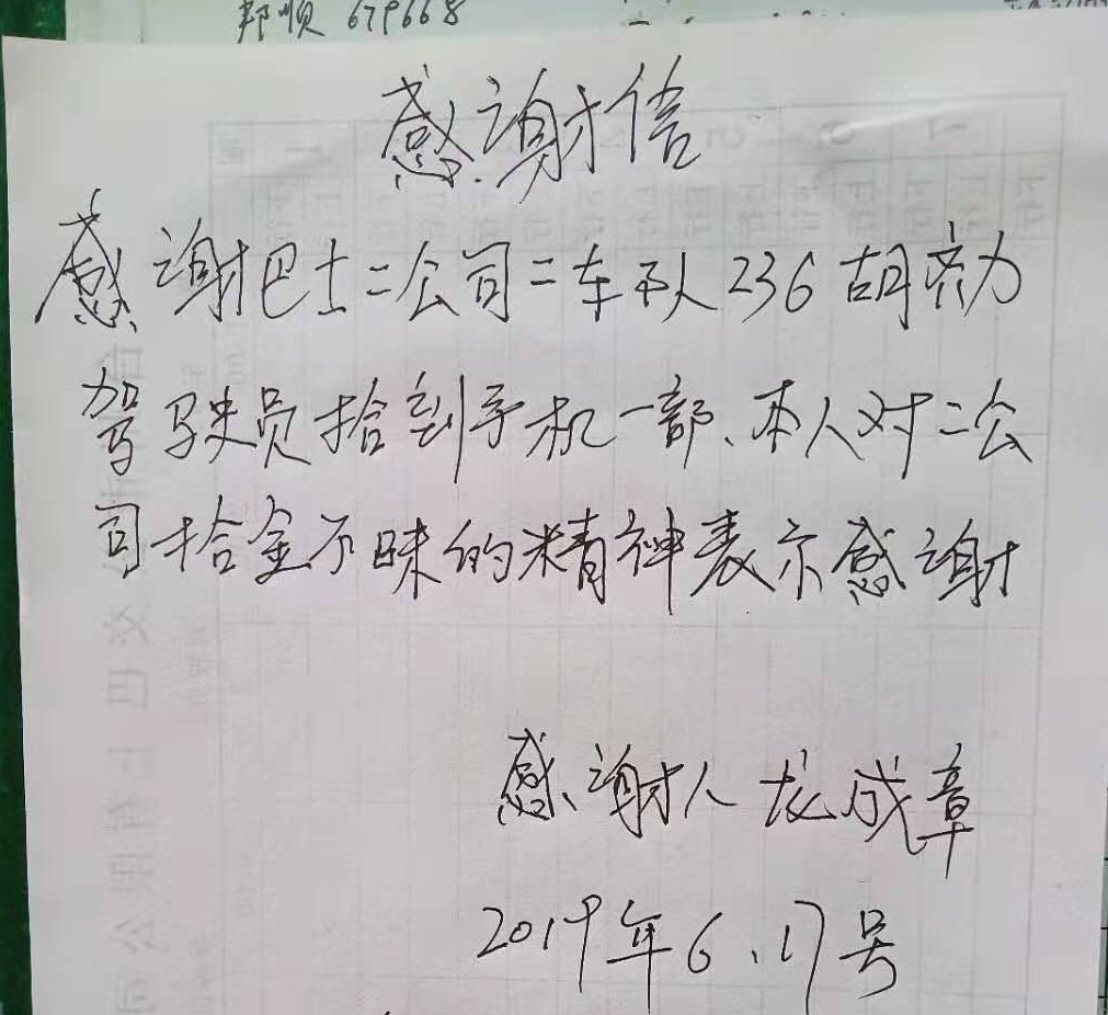 無獨有偶,當天下午17點左右,駕駛員胡齊力師傅結束一天的運營回到場站進行例檢,也發現了一位乘客丟失的手機。失主龍先生于下午18點左右到院橋車場領回遺失的手機時,駕駛員胡師傅已經下班。于是,龍先生特地寫了一封感謝信留給駕駛員,對公司駕駛員良好的精神風貌和職業素養進行表揚。