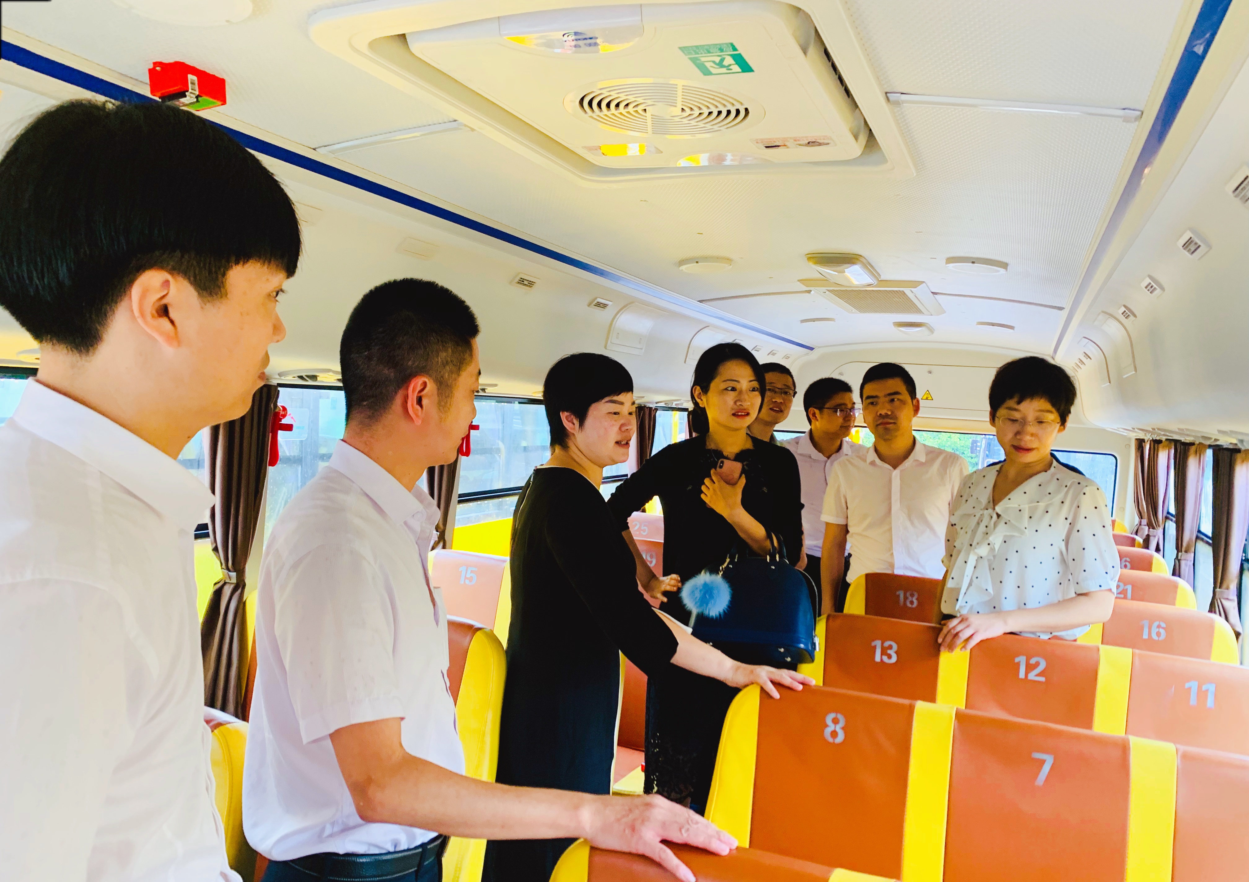 調研組首先實地參觀了在場停放的校車,向校車公司負責人詳細了解了校車的網絡購票系統、電子點名系統、實時定位系統、到站信息提醒功能等軟件設施。同時,上車查看了車內巡查按鈕、車窗、頂風窗安全出口、應急逃生門急救箱、一鍵破窗等安全設施配置情況。