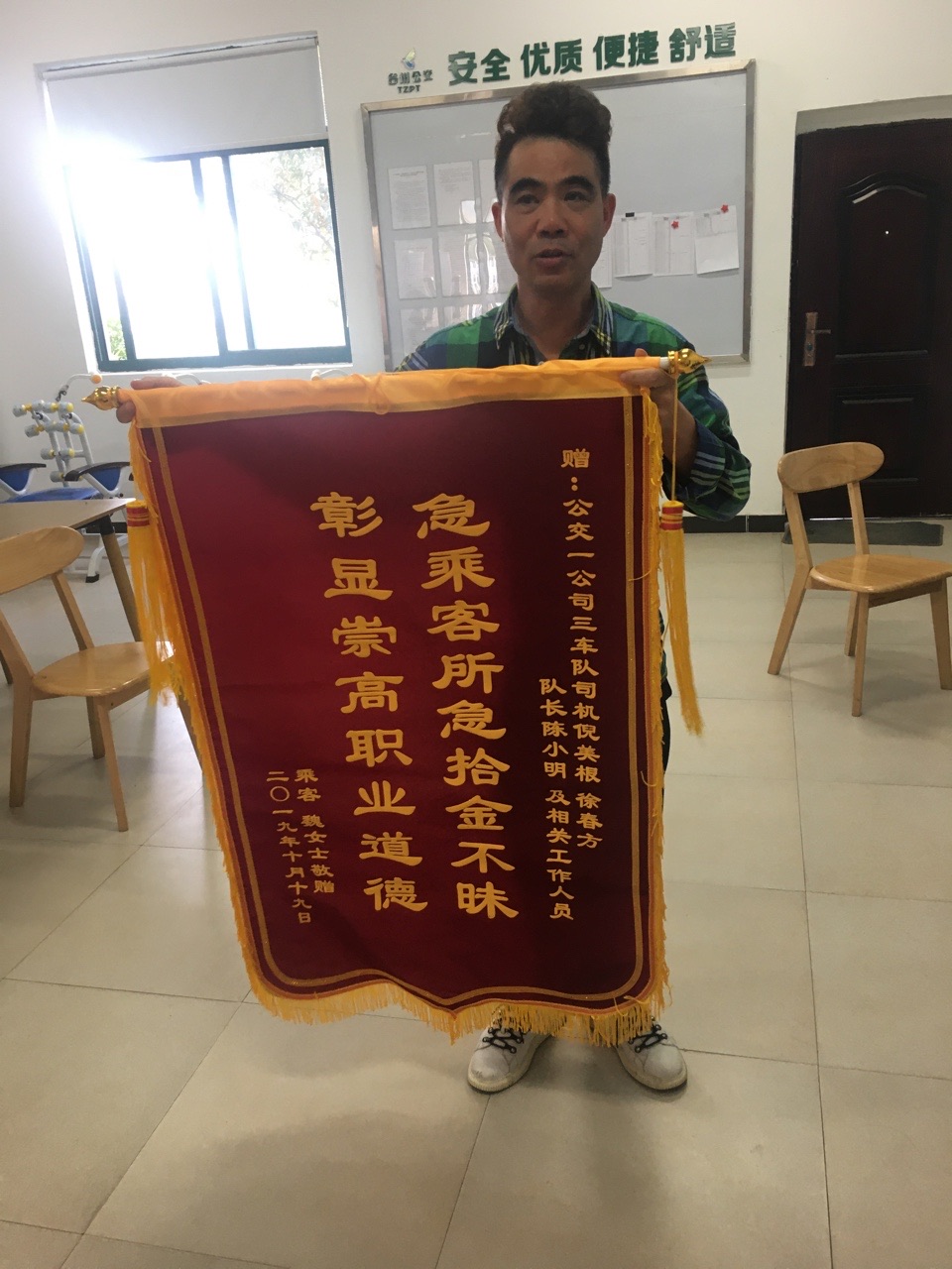 10月22日,巴士公司一公司三車隊收到了乘客徐女士贈予的一面錦旗,上面寫著“急乘客之所急,彰顯崇高職業道德”。