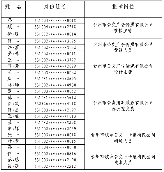 根據《臺州市公共交通集團有限公司關于下屬子公司公開招聘工作人員的公告》及各職位報名情況,下屬競爭性子公司中的臺州市城鄉公交一卡通有限公司銷售人員崗位因報名人數不足,報經集團審核后同意該崗位招聘人數核減至1名?,F經組織招聘資格審查,下列報名人員通過資格審核,擬進入下一招聘程序。具體名單及考試安排如下: